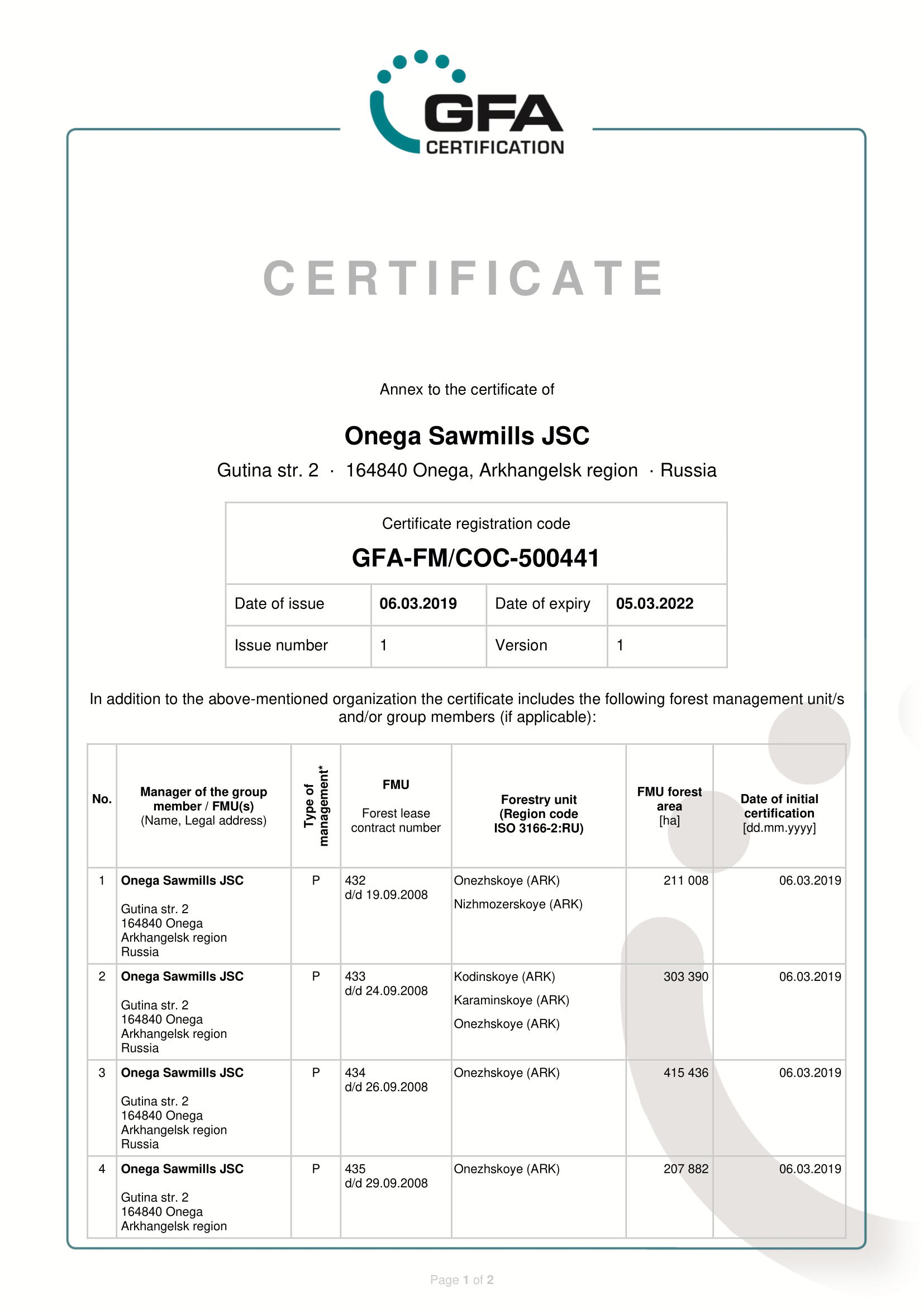 В настоящее время филиал АО «Онежский ЛДК» по лесным ресурсам провел сертификацию в соответствии с принципами критериями Forest Stewardship Council, в соответствии с принципами критериями Programme for the Endorsement of Forest Certification Schemes на площади более 1,5 миллиона гектаров, что составляет 100% всех арендуемых лесов АО «Онежский ЛДК». АО «Онежский ЛДК» имеет действующие сертификаты лесоуправления и цепи поставок GFA–FM/COC–002866 Forest Stewardship Council, GFA–FM/COC–500441 (Programme for the Endorsement of Forest Certification Schemes) филиал АО «Онежский ЛДК» по лесным ресурсам ежегодно подтверждает его соответствие строгими международными стандартами.