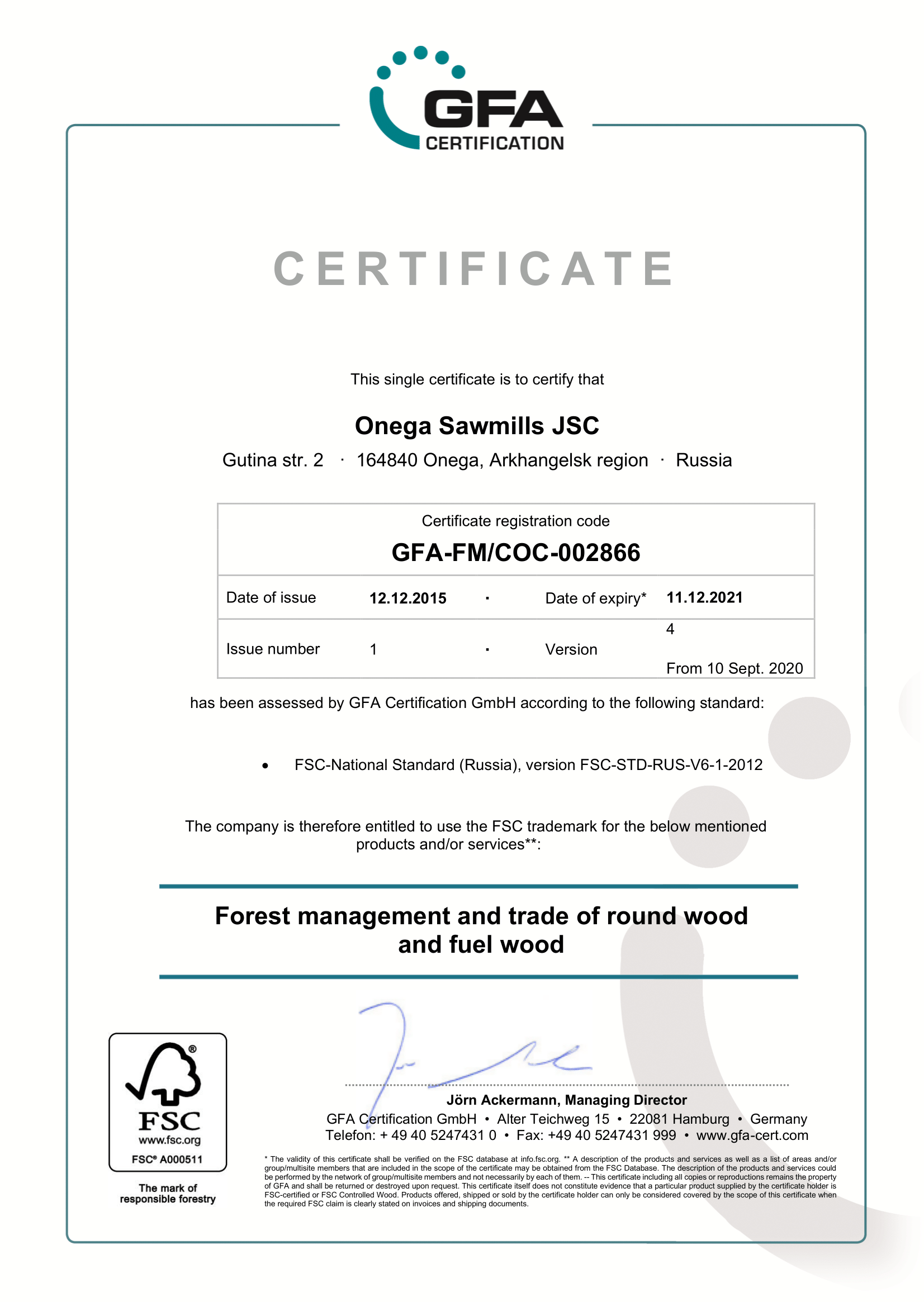 С 2003 г. Организация вовлечена в процесс добровольной лесной сертификации лесопользования и лесоуправления по международной системе Forest Stewardship Council® (FSC C 128025) и одна из первых получила сертификат FM/COC.